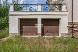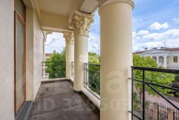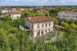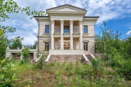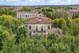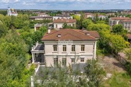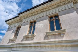 Этот дом, возведенный из керамического кирпича в классическом архитектурном стиле, украшен светлыми колоннами и балконными ограждениями. Для облицовки фасада использован натуральный камень - травертин.