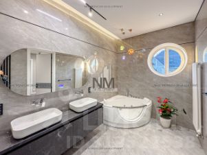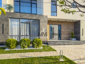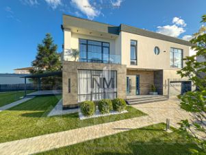При отделке дома использовались натуральные материалы премиального качества: редкая полупрозрачная порода оникса с прожилками, мрамор, кварц, гранит для облицовки фасада цоколя, гипс, шпон экзотических пород древесины. Цветовая палитра выдержана в спокойных тонах, которые подчеркивают элегантность и изысканность пространства. Благодаря современному проекту в доме панорамное остекление (энергоэффективные окна Rehau), отопление дома осуществляется внутрипольными конвекторами KVVZ, настенными радиаторами Zehnder и группой дизайнерских радиаторов Loten Line V Black. Все коммуникации - центральные. Особое внимание в доме уделено: сердцу дома (итальянский качественный котел), климату (встроенная система канального кондиционирования), инженерным системам а также установлена уникальная американская система встроенный пылесос. Во всех комнатах трековое дизайнерское освещение, что позволяет осуществить полный контроль над светом и установить необходимое кол-во светильников разных цветовых температур.