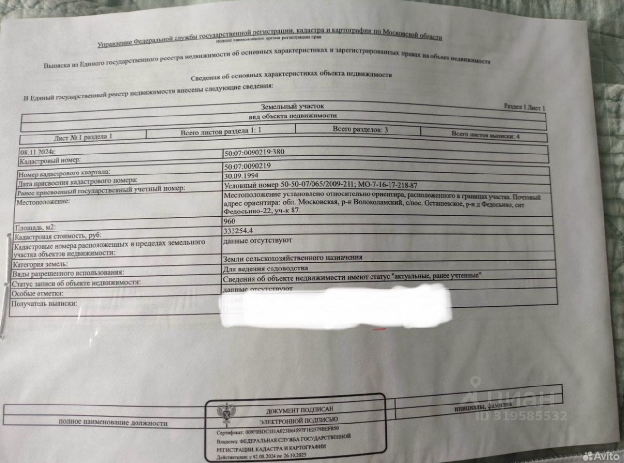 Кадастровый номер участка 50:07:0090219:*** указал продавец