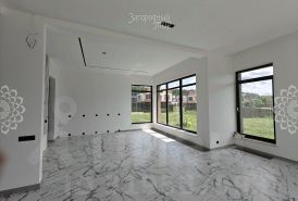 на первом этаже встроенный гараж на две машины и ещё два крытых машиноместа рядом с домом. Из гаража можно попасть в прихожую, оттуда в большую кухню - столовую и просторную, светлую гостиную с выходом на террасу. Рядом котельная и санузел, лестница на второй этаж. Здесь 4 спальни, каждая со своим санузлом и гардеробной, а две с выходом на балконы. На третьем этаже - помещение свободного назначения и выход на эксплуатируемую кровлю с шикарным видом на посёлок и окрестности.