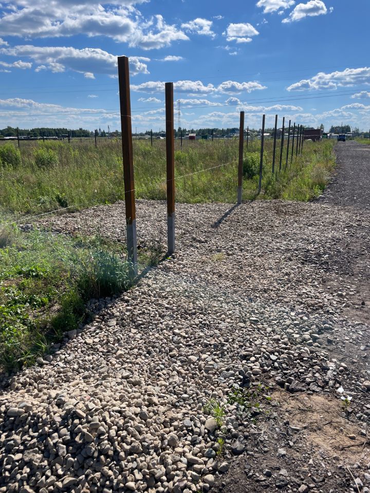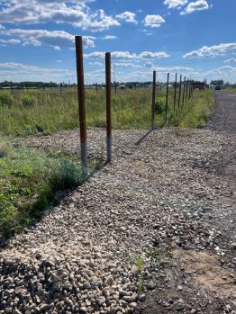 Есть электричество, сделан въезд, установлены столбы под забор ( по 3-м сторонам)