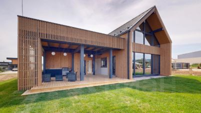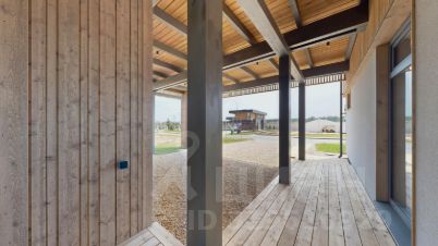 Уличная терраса, хозблок и навес для 2-х автомобилей под единой крышей с домом