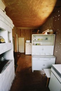 На 1 этаже расположены: прихожая, кухня с печкой на собственном фундаменте, кладовка, большая комната с 3-мя окнами.