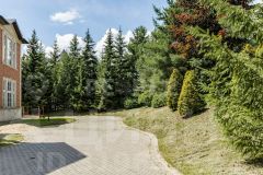 Большой участок с лесом, правильной формы, газон, по периметру участка вековые сосны и ели.