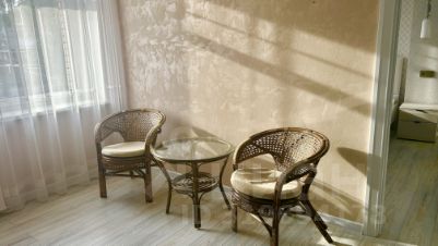 Внутри сделан дизайн-ремонт качественными современными материалами: на полах керамогранит и немецкий ламинат, стены окрашены и в спальнях оклеены обоями также немецкого производства, установлены дорогие межкомнатные двери. В зонах керамогранита разведены теплые полы.