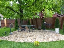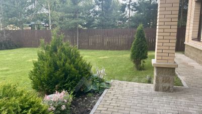 Участок 12,4 соток правильной формы, огорожен забором на бетонном основании, установлены ворота с электроприводом. На участке ухоженный газон, сделан дренаж, организованы клумбы с цветами, вымощены дорожки. Имеются хозпостройки под хранение инвентаря, обустроен холодный погреб.