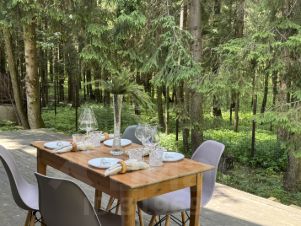 - гостиная с высокими потолками (7 м), вторым светом и панорамными окнами с видом на сосновый лес наполнят пространство воздухом
