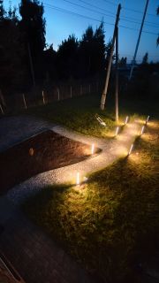 На участке отсыпана дорожка и установлено фонарное освежение. Вокруг дома - дренажная система.