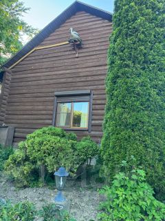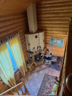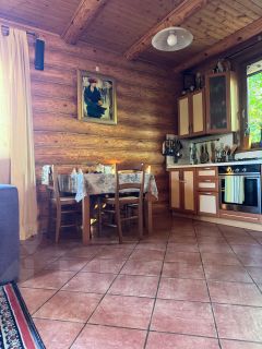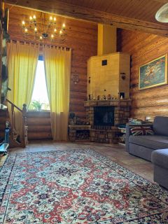 Дом 2-х этажный из оцилиндрованного бревна, полностью мебелирован, коммуникации  заведены в дом: 1-й этаж: веранда, кухня-гостиная с камином, совмещенный санузел с душем. 2-й этаж: две спальни. Дом отапливается: камин-печь, пол-подогрев.