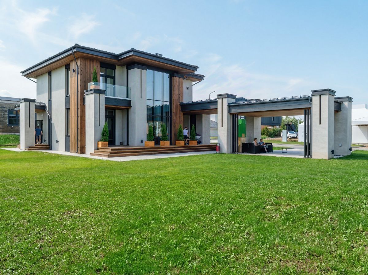 * Просторная терраса и навес под два автомобиля