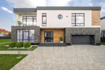 Современный фасад с панорамными окнами, стильный интерьер, качественные материалы в отделке (редкая полупрозрачная порода оникса с прожилками, мрамор, кварц, гранит для облицовки фасада цоколя, гипс, шпон экзотических пород древесины).