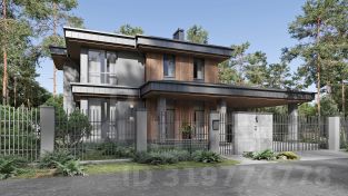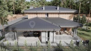 Дом площадью 246 квадратных метров построен на земельном участке 8,98 соток. Особенностью проекта является геометрия свесов кровли. Образующиеся навесы над крыльцом, террасой и парковочным местом увеличивают полезную площадь и