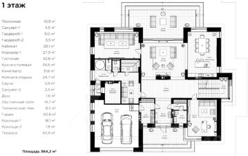 Дом площадью 561 квадратных метров построен на земельном участке 20 соток. Особенностью проекта является геометрия свесов кровли. Образующиеся навесы над крыльцом, террасой и парковочным местом увеличивают полезную площадь и