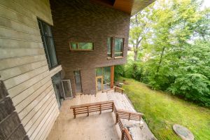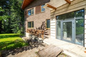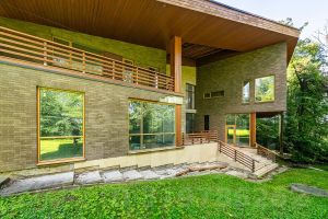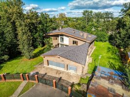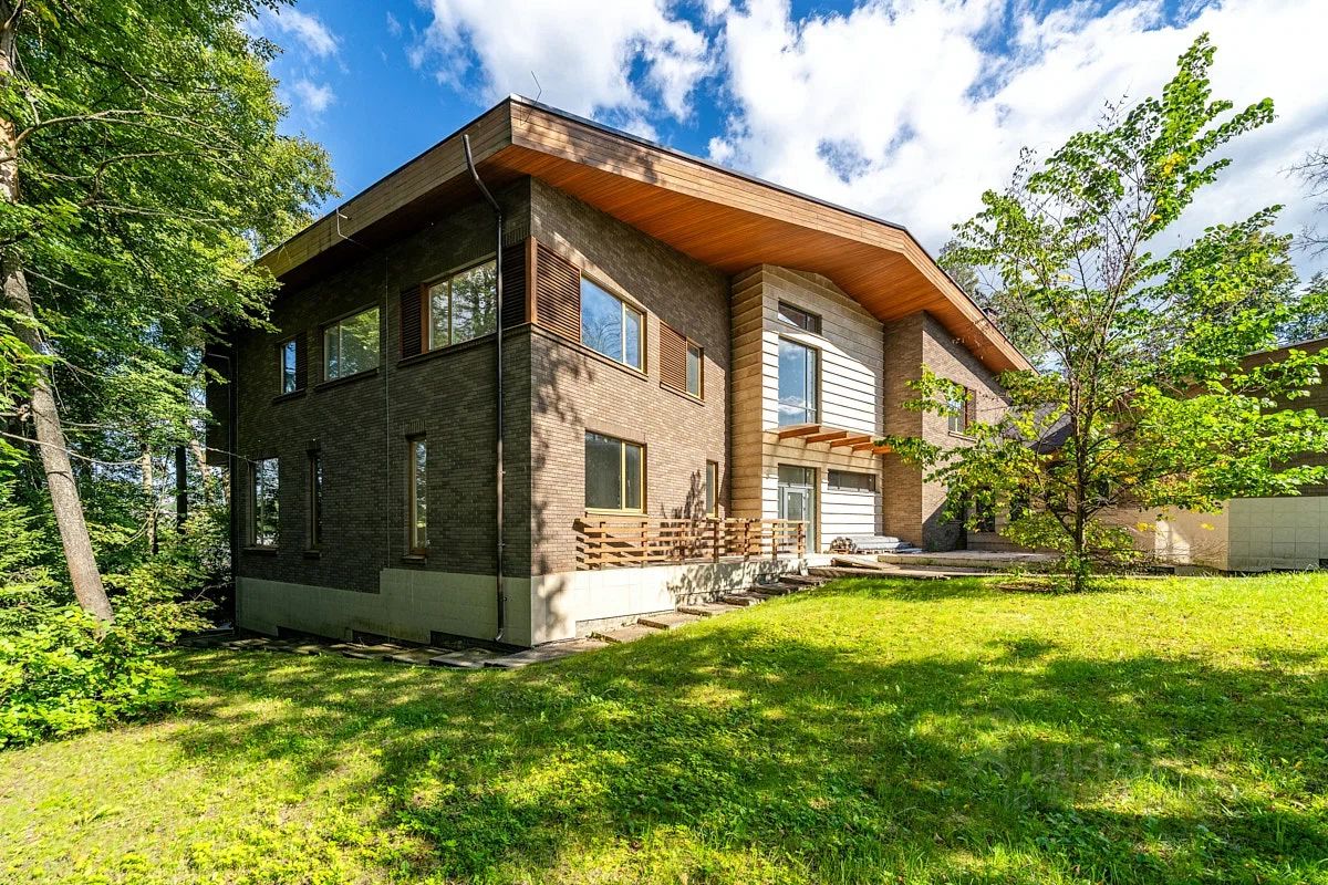 рельефном лесном участке 40,5соток. Фасад выполнен из клинкерного кирпича с