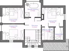 На 2-м этаже: мастер-спальня с отдельной ванной и гардеробом и 2 спальни (детские), а также общая ванная комната с большой ванной и окном.