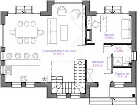 На 1-м этаже расположена уютная кухня-гостиная с камином и видовыми окнами и кабинет (можно переоборудовать под гостевую). Есть возможность дополнительно построить большую террасу и навес для автомобиля.