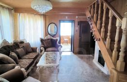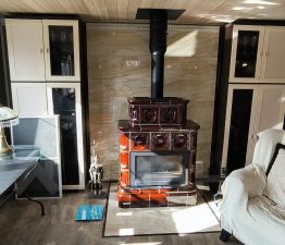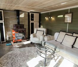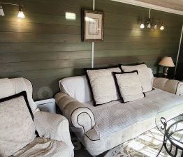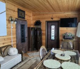 2. Уютный гостевой дом площадью 62,3 м², оборудованный камином и сауной, отделанный лиственницей — здесь ваши гости будут чувствовать себя как дома.