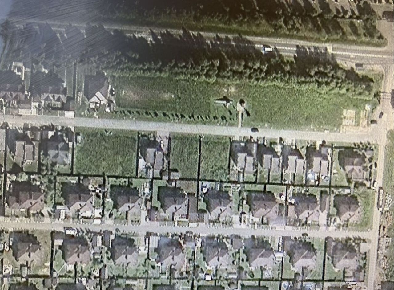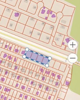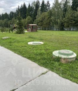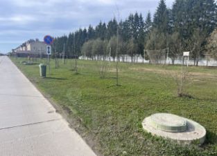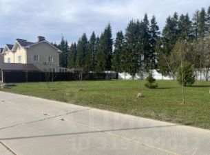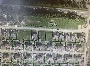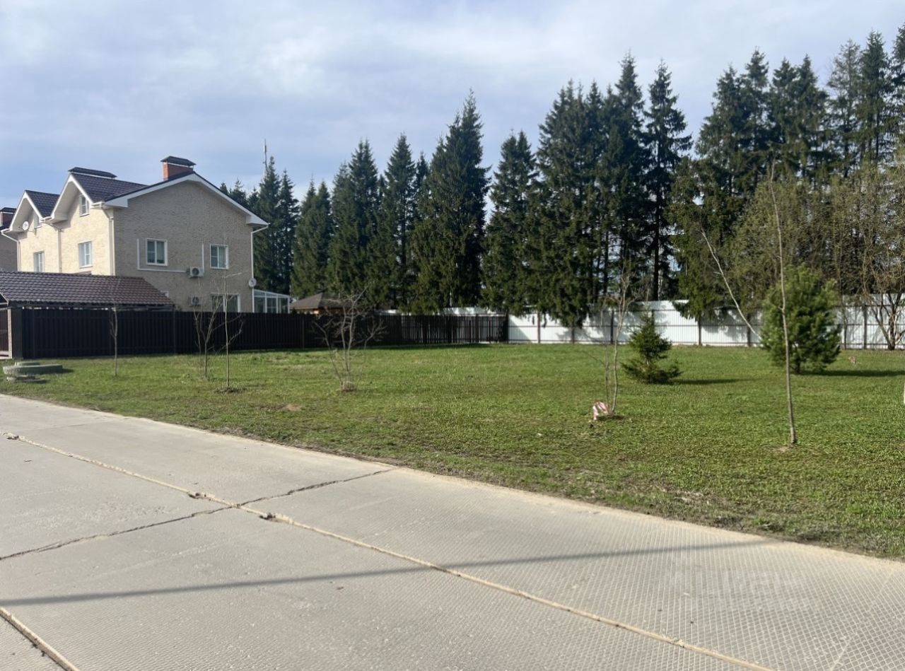Участок, ровный прямоугольной формы на первой линии коттеджного поселка , сзади участка огорожен забором, высажены деревья.