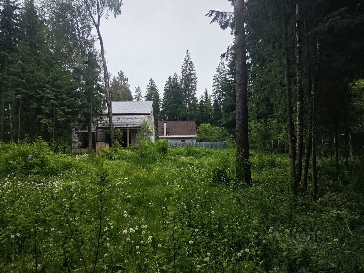 На участке растут взрослые ели, берёзы, лиственные деревья