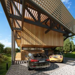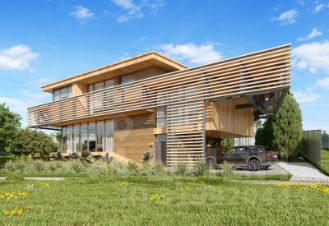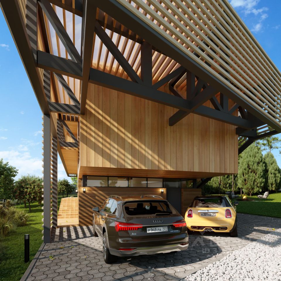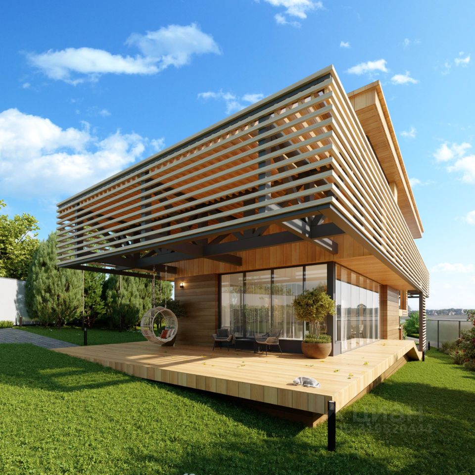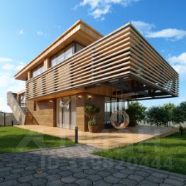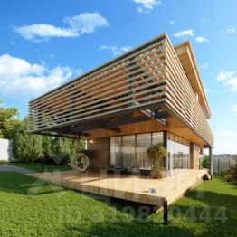 Дом: 200 м² (теплый контур) + 140 м² террас/навеса. Современный эко-хай-тек.