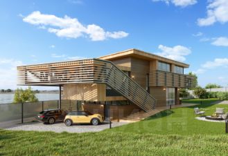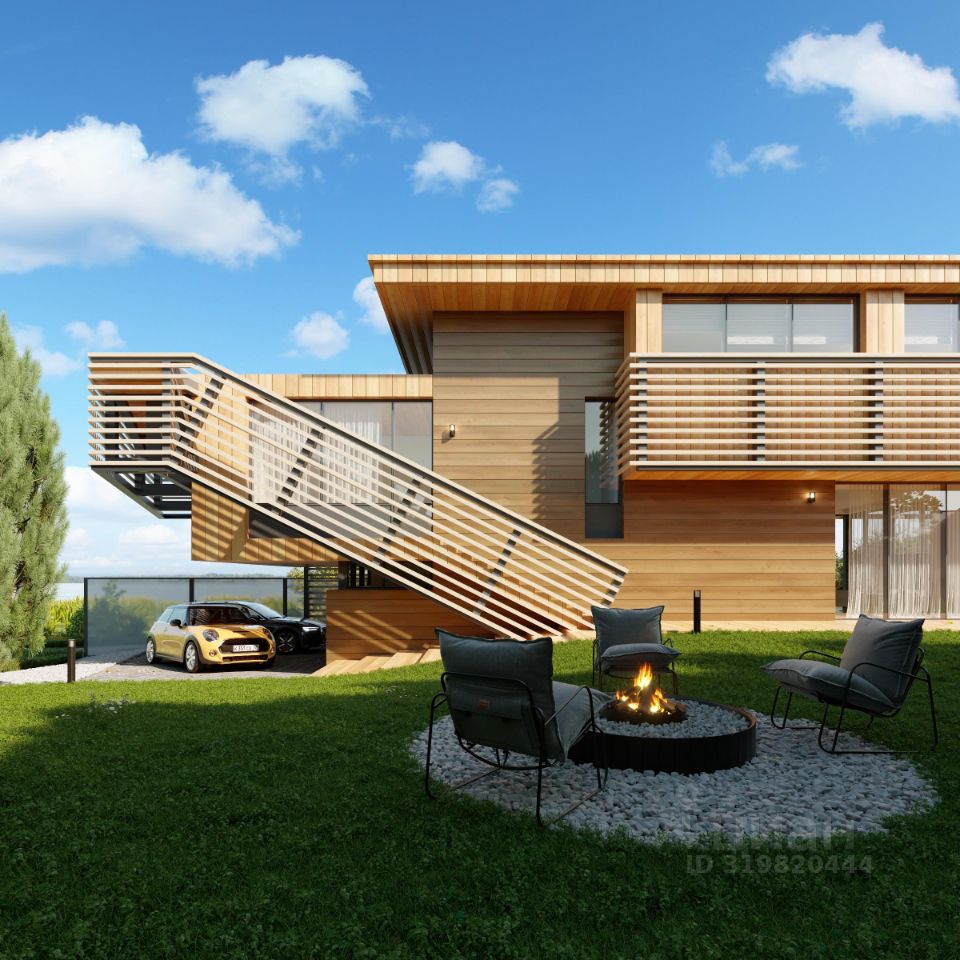 Фасад: Сибирская лиственница с натуральной пропиткой, панорамное остекление.