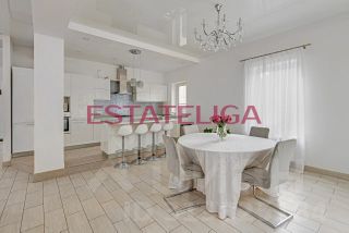 Коттедж выполнен в спокойном современном стиле в светлых тонах и построен по проекту архитектора Евгения Окиншевич.