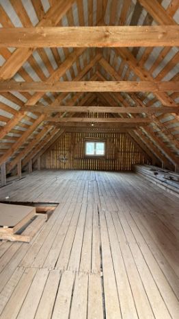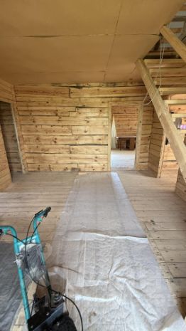 1-ый этаж (утепленный) в чистоте 9Х10 м с перерубом по длинной стене. Потолок (Н-2,7м.).2-й этаж мансарда 10х10 м свободной планировки, высота конька 5 м. Стропильная часть - брус 200Х70 мм. Крыша андулин (коричневый) с пароизоляционной подложкой. Окна стеклопакеты Rechau.