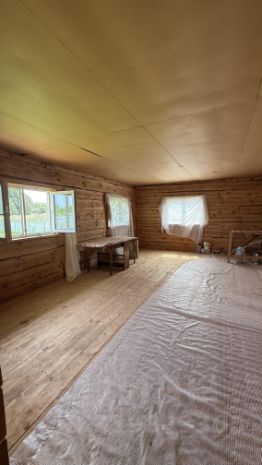 Материалы стен, полов , потолков натуральное дерево, в доме стоит шикарный благородный аромат! Стены из брянской сосны диаметром 36 см. (опиленной с внешней и внутренних сторон для удобства отделки) положены на мох.Ширина внутренних стен 15 см. Выстоян в течении 7 зим, затем пробит паклей. Отделан сайдингом с наружной стороны (светло- желтый) с устройством пароизоляции.