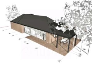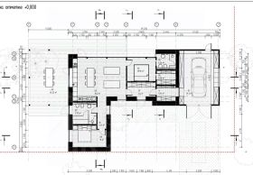 — 1 этаж: прихожая, кухня-столовая со вторым светом, панорамным остеклением и выходом на террасу, мастер-спальня с гардеробной и с/у, гостевая спальня, с\у, гараж с возможностью входа в дом через котельную. 114 кв м