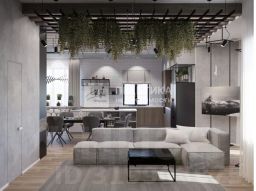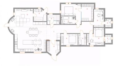 Общая площадь дома составляет 196,8 м2. На одном этаже размещается хорошо освещенная кухня-столовая и просторная гостиная с выходом в сад, спальня и детская с собственными ванными комнатами, большая гардеробная, кабинет, сауна и помещения хозяйственного назначения.