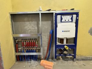Проведена электрическая разводка и полностью вся сантехника и отопление. Смонтирована котельная с премиальным немецким котлом Buderus. Установлены инсталляции для унитазов Geberit и дизайнерские радиаторы во всех комнатах и центральное кондиционирование.