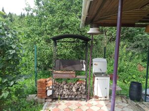 Баня 5 на 6 м из пеноблоков на ленточном фундаменте (парилка, моечная и комната) в рабочем состоянии. Вода и свет подведены. Слева от бани дровник под навесом. За баней устроен сарай-мастерская 2,5 на 5 м для хранения инструментов и инвентаря.
