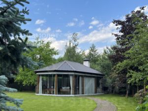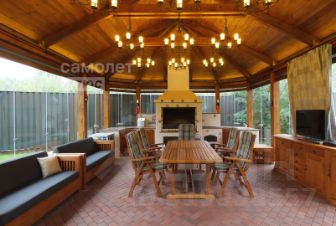 На участке так же расположен служебный дом в едином с коттеджем стиле. Служебный дом 147,8 кв.м состоит из основного 101,5 кв.м (гараж на 2 м/м с инструментальной, комната для персонала, с/у, котельная, генераторная) и жилой пристройки 46,3 кв.м (без отделки с заведенными коммуникациями). Отдельно стоящий сруб с заведенными коммуникациями (свет, вода, канализация, действующее отопление), в котором можно оборудовать баню или гостевой дом. Великолепная беседка 49,8 кв.м с раздвижными стеклянными стенами расширяющими пространство, печным комплексом (мангал, электровертел, казан), разведенными системами: водоснабжения, телевидения, телефонии, органично вписана в проект.