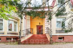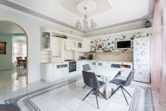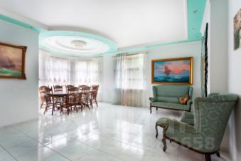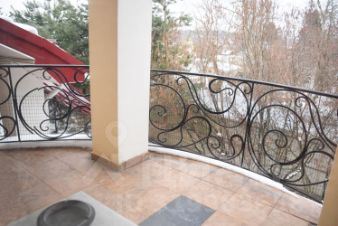 Первый этаж: Прекрасная просторная кухня столовая 22 кв.м. соединяется с большой гостиной 24 кв.м. Все помещения меблированы со вкусом и оптимальной функциональностью. В доме высокая дубовая лестница ведёт на второй жилой этаж. Полукруглый широкий балкон с видом в сад украшенный колоннами и кованой узорочной оградой в виде виноградных лоз прекрасное место для утренней чашечки кофе в кругу семьи.