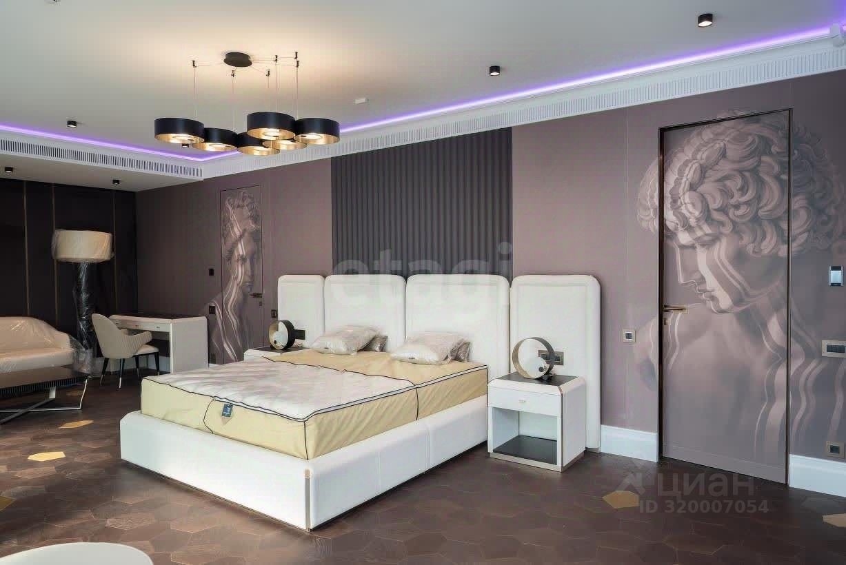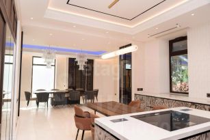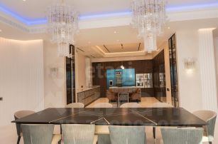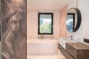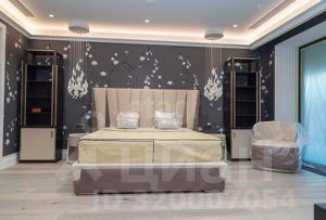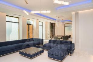 Техническое оснащение включает системы климат-контроля, приточной вентиляции, очистки воздуха и комплекс безопасности с видеонаблюдением. Планировка функционально зонирована. Цокольный уровень площадью 493 м² отведен под рекреацию и wellness-зону: здесь расположены домашний кинотеатр, бильярдная, сауна, хаммам и кальянная. На первом этаже (387 м²) находится гостиная с камином, объединенная с кухней, выходом на террасу и гостовая комната с санузлом. Второй этаж (293 м²) занимают две спальни с индивидуальными санузлами, кабинет и игровая. На третьем уровне обустроена изолированная зона с гостиной, кухней, спальней и мансардой, идеальная для членов семьи или гостей. Отдельный блок для персонала с собственным входом дополняет инфраструктуру.