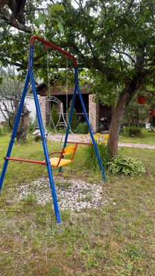 Детские качели. Яблони, шикарный виноград( плодоносит каждый год). Арка с виноградом. Выгребная яма. Качели для взрослых.