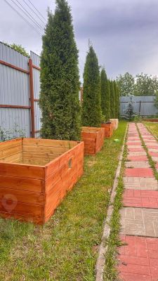 Участок ухожен, современные высокие грядки , туи.