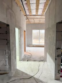 Коммуникации: свет 15кВт, вода - скважина 42 м, канализация, разведены и готовы к подключению. Отопление теплые полы. Дом без внутренней отделки, внутренние стены оштукатурены, внешние утеплены , дом сейчас отапливается, вода заведена в дом.