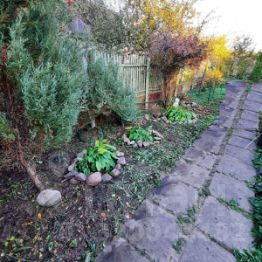 На территории растут такие растения: черная и красная смородина, калина, малина, крыжовник, гортензия, розы, хосты, туи, рябина, яблоня, барбарис и др.