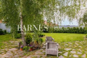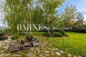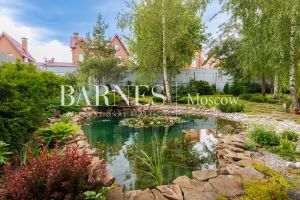 Участок ровный, с ландшафтными работами: газон, дорожки, прудик с водопадом и рыбками, декоративные насаждения, плодовые деревья и кустарники.