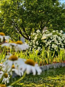 Участок ухоженный, правильной прямоугольной формы. Посажены цветы, плодовые и декоративные деревья и кустарники.