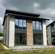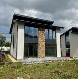 Конструктив дома: фундамент монолитная плита, стены полнотелый кирпич + утеплитель минвата 150мм, штукатурка, отделочный кирпич, окна двухкамерный энергосберегающий стеклопакет, панорамное остекление в зоне гостиной теплый алюминий с двухкамерным энергосберегающим стеклопакетом, кровля мягкая черепица.