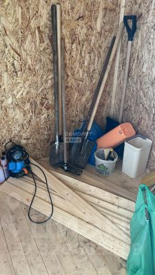 Остается - инвентарь: лопаты, грабли и др., насос для колодца со шлангами, диван.
