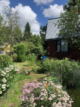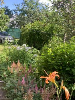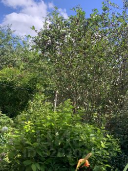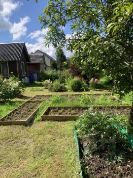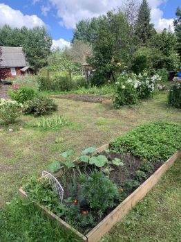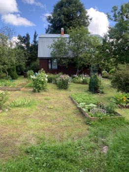 На участке много цветов, сирень, есть грядки с клубникой , ягодные кустарники: смородина, крыжовник, малина; плодовые деревья: яблони, черноплодная рябина.