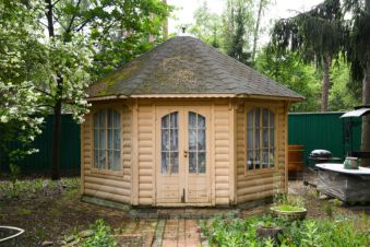 На участке большая, закрытая беседка, хоз.блок, летний туалет, крытая парковка.