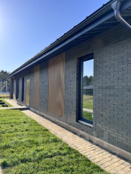 Дом на монолитном фундаменте, стены из газоблока 400мм с отделкой из кирпича 120мм и декоративными рейками.