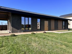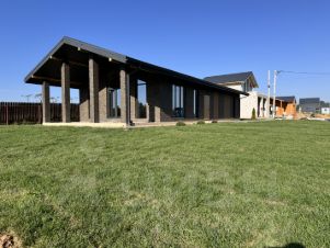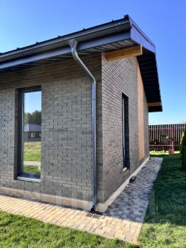 На участке выполнен дренаж, сделана теплая отмостка из брусчатки, парковка, выровнен и засеян газон.