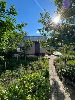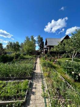 * Мангальная зона, благоустроенный участок с тротуарной плиткой, грядки с фруктовыми деревьями и кустарниками, цветами; плодородная почва (чернозём).