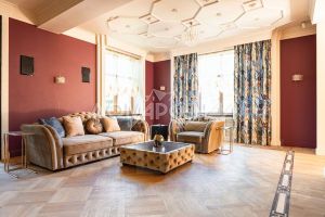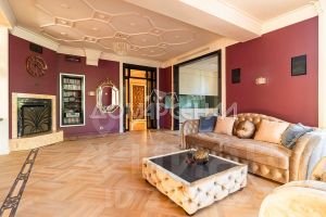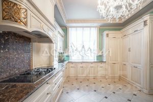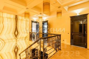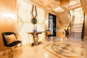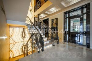 • Лестница обрамлена кованым ограждением с рисунком "цветущий сад" по канонам стиля ар-деко и потрясающим панно из натурального оникса с подсветкой