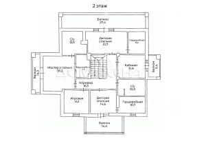2 этаж: мастер-спальня с выходном на террасу, детская комната с гардеробной и выходом на террасу, детская комната с гардеробной и балконом, игровая комната, кабинет с балконом, с/у
